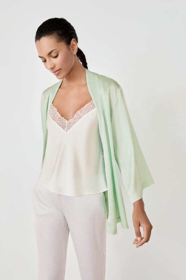 Caraco satiné détails broderie fleurs fermeture bouton devant