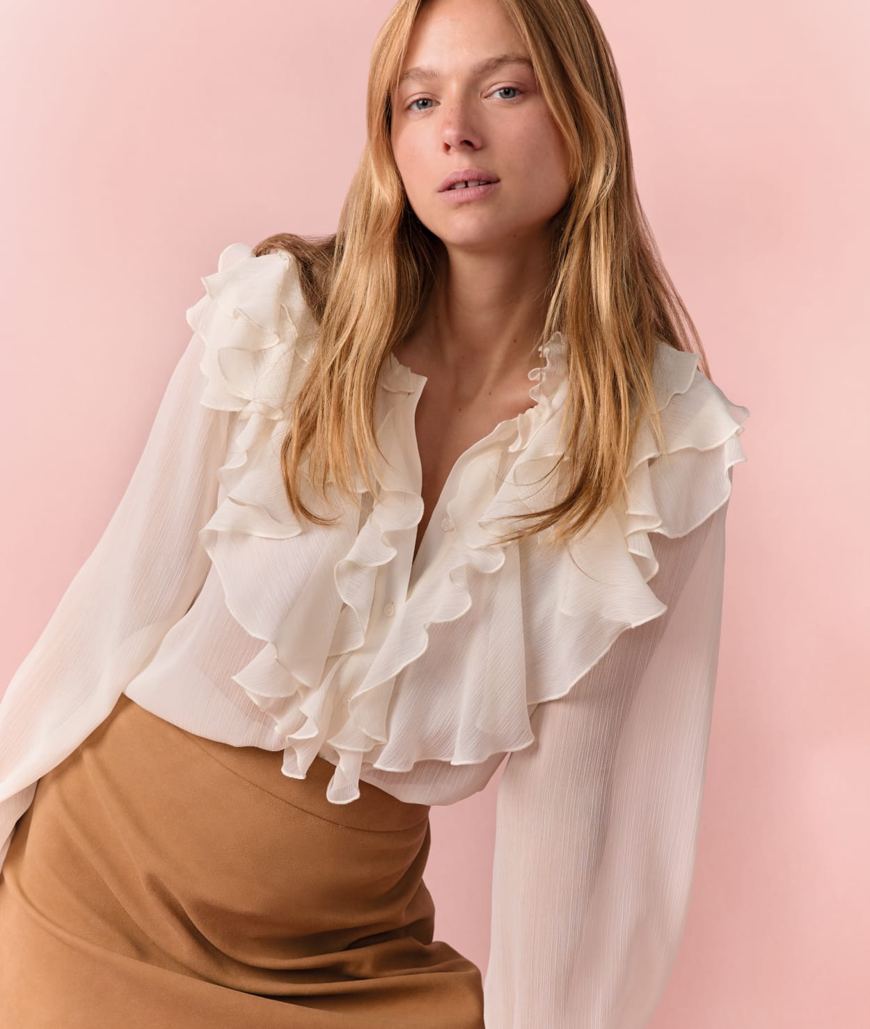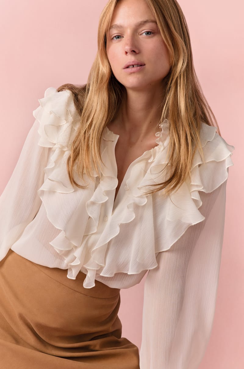 Entre col à volants et coupe fluide, optez pour un look estival avec cette blouse à manches longues tout en transparence...