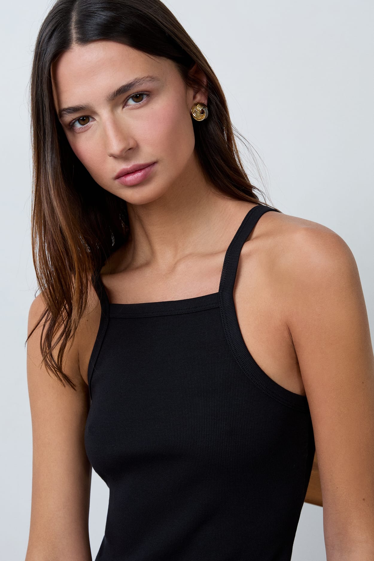 Doté d'un col carré, ce débardeur vous enveloppe de confort grâce à sa matière en coton et sa maille côtelée. Porté...