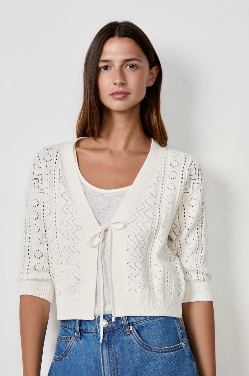 Avec ses détails ajourés, ce gilet joue la carte de la délicatesse. Il se noue à l’avant et dévoile des manches courtes ...